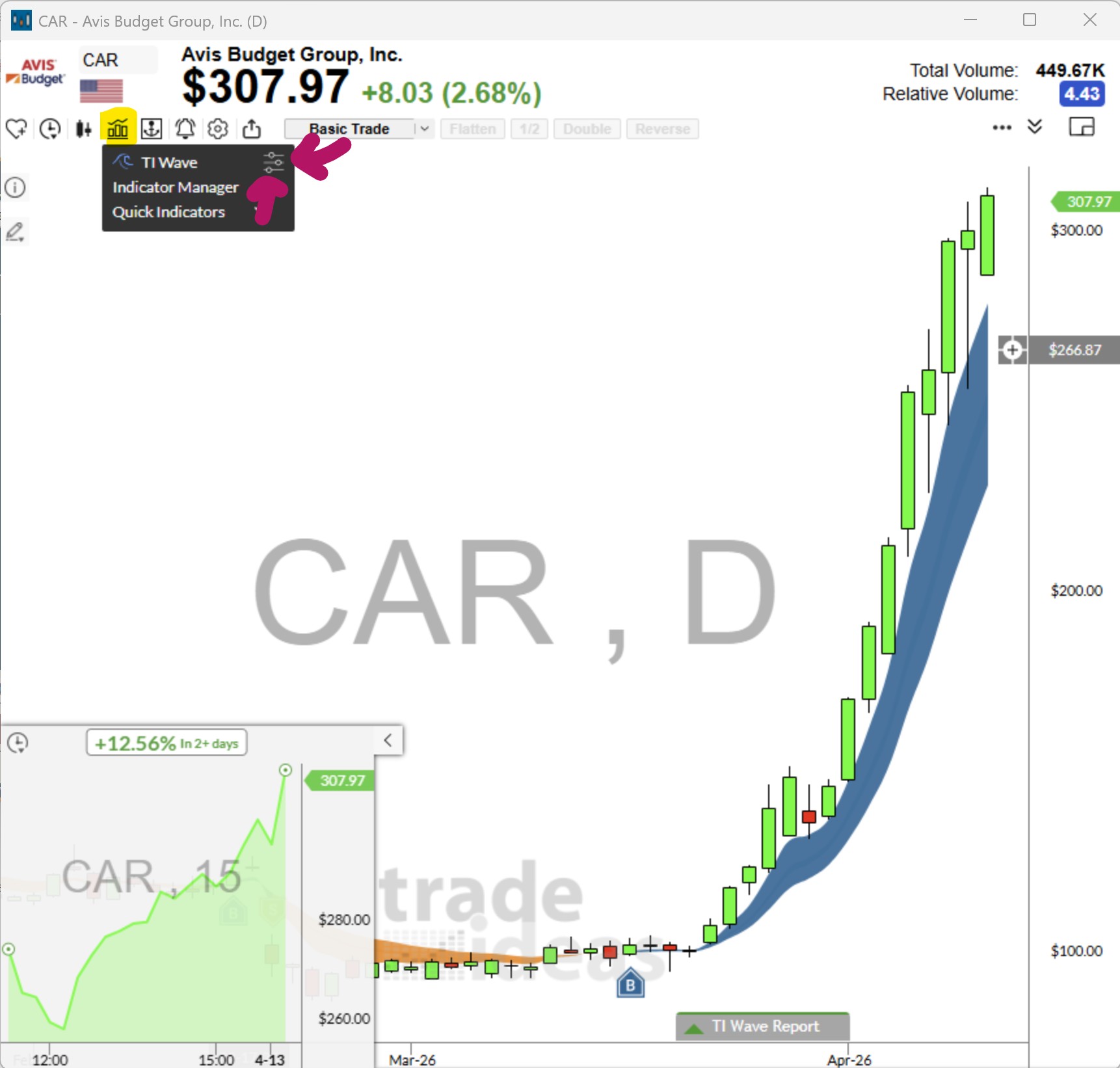 To add TI Wave Buy and Sell signals to your chart, click the bar icon and select TI Wave from the list.
