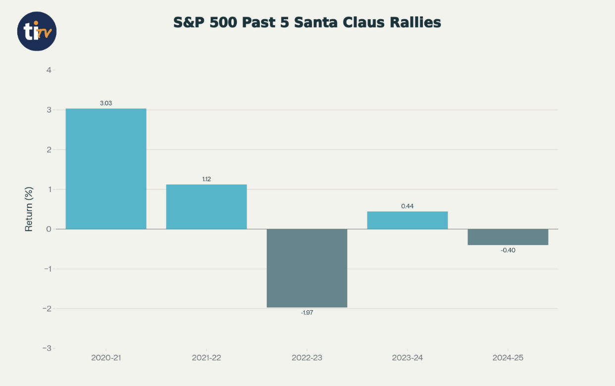 The S&P 500’s performance during the past five Santa Claus Rally periods has been mixed, with three gains and two declines. Overall, the pattern shows that while the effect is often positive, it is not guaranteed.