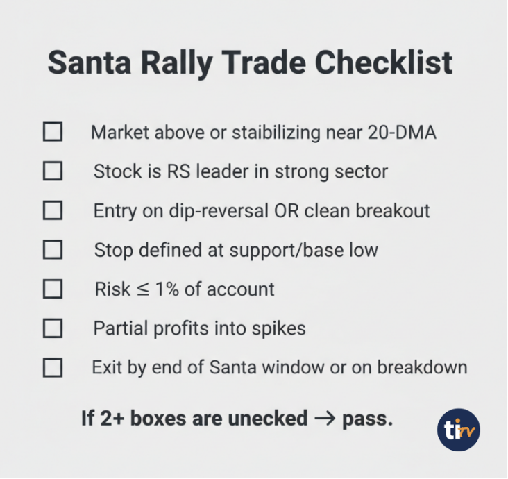 Before you place any Santa-rally trade, run it through this quick checklist. If the setup doesn’t meet most of these conditions, skip it; seasonal edges only work when the chart and market agree.