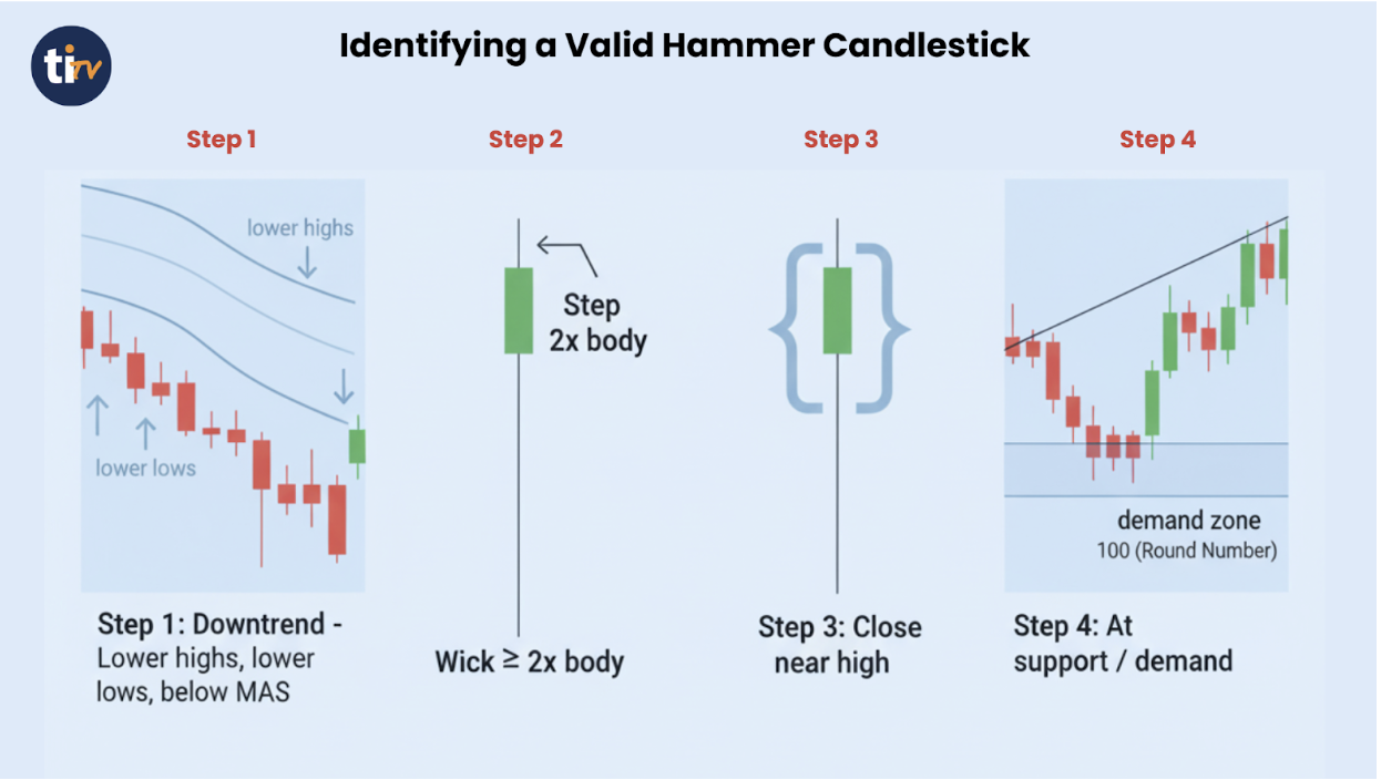 Not every small candle with a wick is a true Hammer. A valid Hammer candlestick must meet specific conditions.