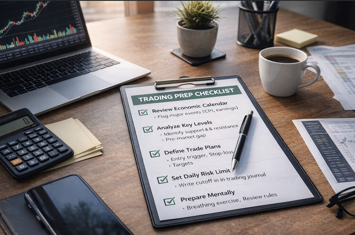 This is the routine most traders skip — and the one that keeps professionals alive during bad streaks. Before the open, calculate your total portfolio exposure and set a hard daily loss limit. Write it down. If you hit that number, the trading day is over. No exceptions. This one rule will save you from the death spiral of revenge trading more than any strategy ever will.