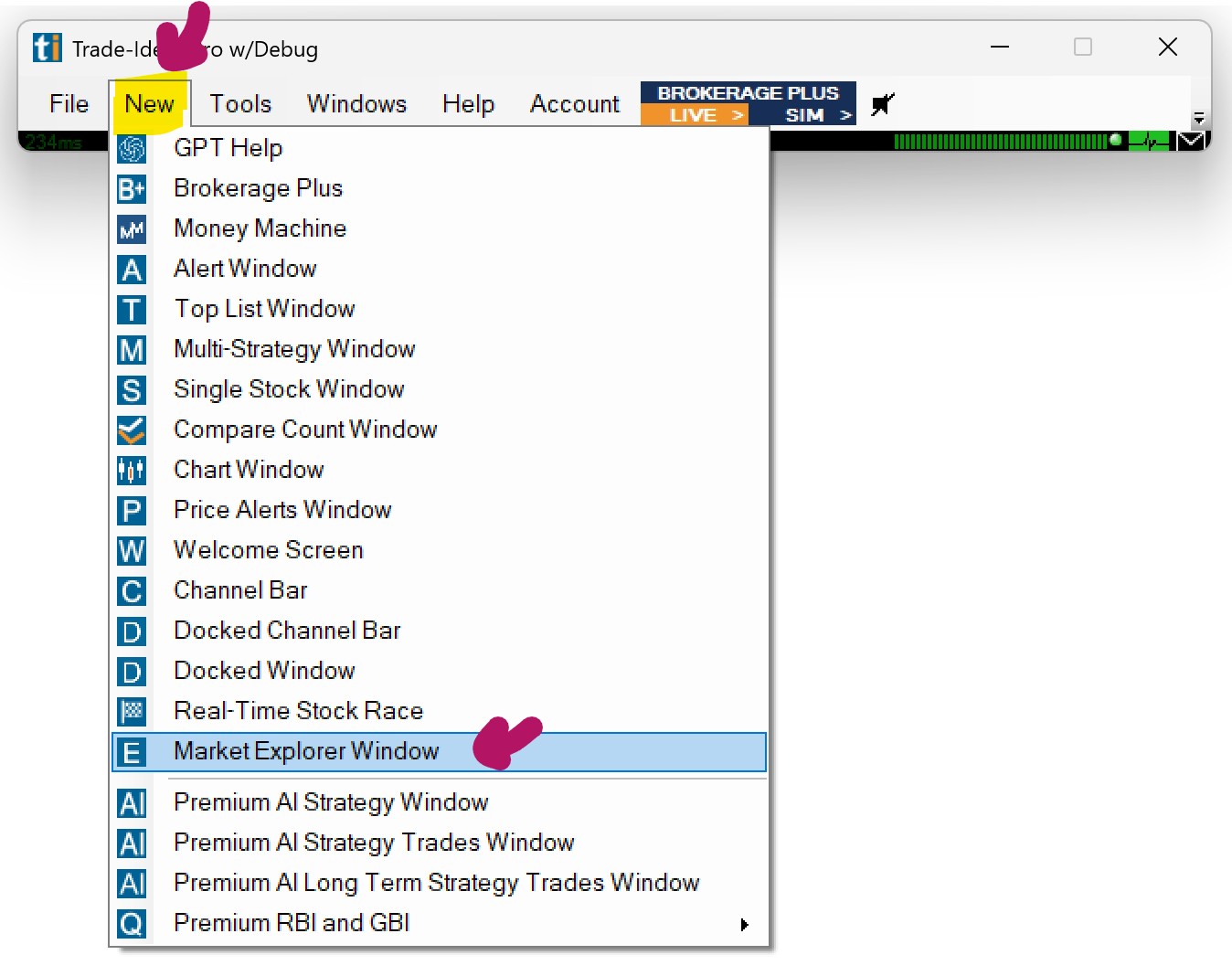 - Open the Market Explorer from the Toolbar bar > New > Market Explorer Window